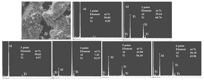 如圖8所示, 電解產(chǎn)品鈦鋁合金分布不均勻。在EDS圖中可以看出, 1、3點(diǎn)具有大顆粒形貌的是金屬鋁, 附著在大顆粒上的小顆粒2、4、5、6, EDS結(jié)果顯示成分為鈦鋁合金。由此推斷:恒壓電解過程中, 金屬鋁率先析出在金屬鉬陰極表面, 由于熔鹽電解過程溫度范圍是660~750℃, 所以金屬鋁以液態(tài)金屬的形式存在, 從而包裹在鉬電極表面形成新的陰極, 再與金屬鈦合金化在表面形成金屬鈦小顆粒。部分合金化的鈦鋁被液態(tài)的金屬鋁包裹, 形成圖中所顯示的大顆粒1、3。綜上所述恒壓電解可以得到鈦鋁合金產(chǎn)物, 但合金中存在鋁、鈦相, 需對(duì)陰極產(chǎn)物純化處理。