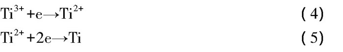 如圖3所示, 在三氯化鋁) 熔鹽體系中, 信號(hào)A對(duì)應(yīng)于堿金屬Na的析出, 反向掃描過程, 沒有對(duì)應(yīng)堿金屬Na的溶解信號(hào), 因?yàn)?50℃金屬Na為液體狀態(tài), 在陰極沉積后就滴落在熔鹽中, 為使反應(yīng)充分進(jìn)行, 750℃恒溫1 h, 在恒溫過程中發(fā)生陰極沉積低落熔鹽現(xiàn)象, 所以圖中沒有出現(xiàn)金屬Na的溶解峰。圖3中可看到兩對(duì)信號(hào)峰B/B'、C/C', 參照Ti離子的還原電位, 對(duì)應(yīng)于Ti (Ⅲ) 離子的兩步法還原過程。根據(jù)B/B'與C/C'的外形可知, 屬于可溶-可溶體系, 即電流先緩慢增加達(dá)到峰值后又緩慢減少。Ti (Ⅲ) 、Ti (Ⅱ) 的反應(yīng)過程如式 (4) 所示。Ti (Ⅱ) 、Ti反應(yīng)過程屬于可溶-不可溶體系, 如式 (5) 所示。圖中沒有顯示尖銳的沉積峰, 由于鈦與鈦低價(jià)態(tài)氯化物的歧化反應(yīng)造成。