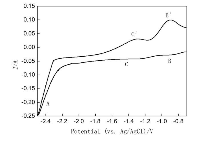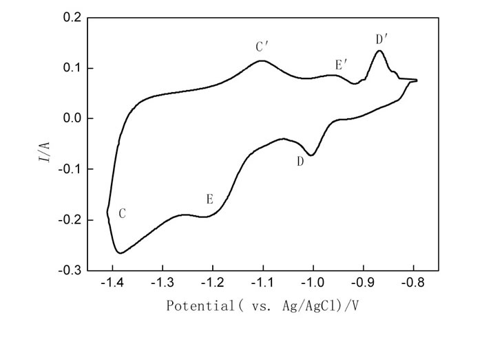 以為熔鹽電解質(zhì), 金屬鉬為工作電極, 石墨為對(duì)電極, Ag/Ag Cl電極為參比電極, 使用循環(huán)伏安進(jìn)行電化學(xué)測(cè)試, 結(jié)果見圖3。