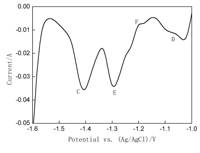 圖5所示, 750℃時(shí), 在熔鹽體系中, 添加過量三氯化鋁, 以20 Hz的信號(hào)頻率, 金屬鉬作為工作電極, 進(jìn)行方波伏安測(cè)試。曲線中-1.4V的陰極電流信號(hào)C對(duì)應(yīng)于金屬鈦的沉積, 與上述循環(huán)伏安結(jié)果相符。在圖中-1.04、-1.3、-1.15 V的3個(gè)信號(hào)峰與循環(huán)伏安結(jié)果相符。C、E、D三個(gè)尖銳峰形狀與固相生成峰形狀相似, 與鈦、鋁、鈦鋁合金標(biāo)準(zhǔn)電位具有微弱的偏差。在-1.15 V處所出現(xiàn)的小峰F, 與鈦鋁合金在鉬電極上欠電位沉積有關(guān)。據(jù)文獻(xiàn)報(bào)道[13-15], Ti (Ⅱ) 離子還原為金屬Ti的電位比Al (Ⅲ) 離子在熔鹽中的還原電位負(fù)。在含有Al (Ⅲ) 離子的熔鹽中, Ti (Ⅱ) 的沉積電位要正于Al (Ⅲ) 離子的沉積電位, 這是由于欠電位沉積 (UPD) 引起。