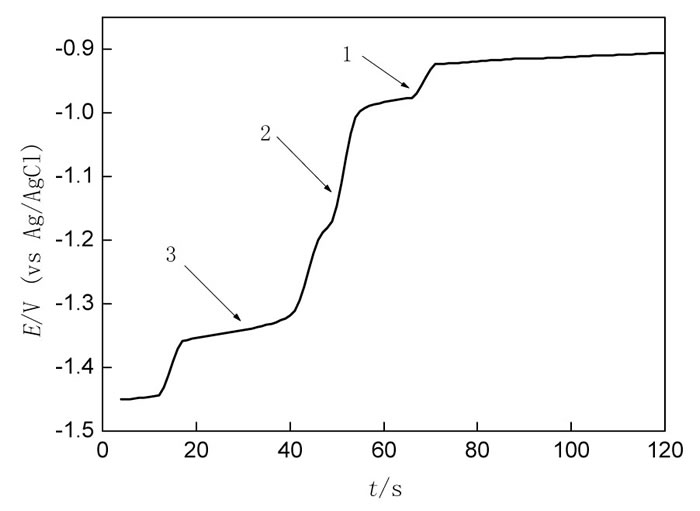 開路計(jì)時(shí)電位法可以用于研究電沉積合金的過程。原理是:通過恒電位電解, 在工作電極表面形成合金層, 記錄電極電位隨時(shí)間的變化數(shù)值, 據(jù)此繪制成曲線, 其中曲線平臺(tái)代表兩相共存狀態(tài)[16-17]。