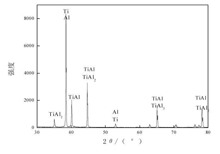 電解鈦試驗(yàn)過程中, 電解產(chǎn)品鈦粉收集困難, 因?yàn)殛帢O產(chǎn)品容易脫落在熔鹽中而導(dǎo)致電極表面附著量較少。對(duì)應(yīng)于鈦鋁合金熔鹽電解過程也存在相同的問題。XRD圖譜顯示, 電解產(chǎn)物非純相鈦鋁合金還有金屬鈦、金屬鋁相, 高溫電解過程不可控因素較多, 所以對(duì)電解產(chǎn)物成分控制仍需進(jìn)行進(jìn)一步深入研究。